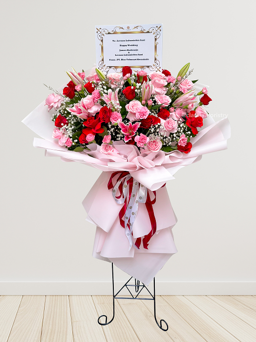 Standing Flower untuk Pernikahan: Untuk acara pernikahan, standing flower bisa menambah kemewahan dekorasi ruangan. Rangkaian bunga yang tinggi dan elegan akan membuat suasana pernikahan lebih berkelas dan indah. Kami memiliki berbagai pilihan desain yang bisa disesuaikan dengan tema pernikahanmu.